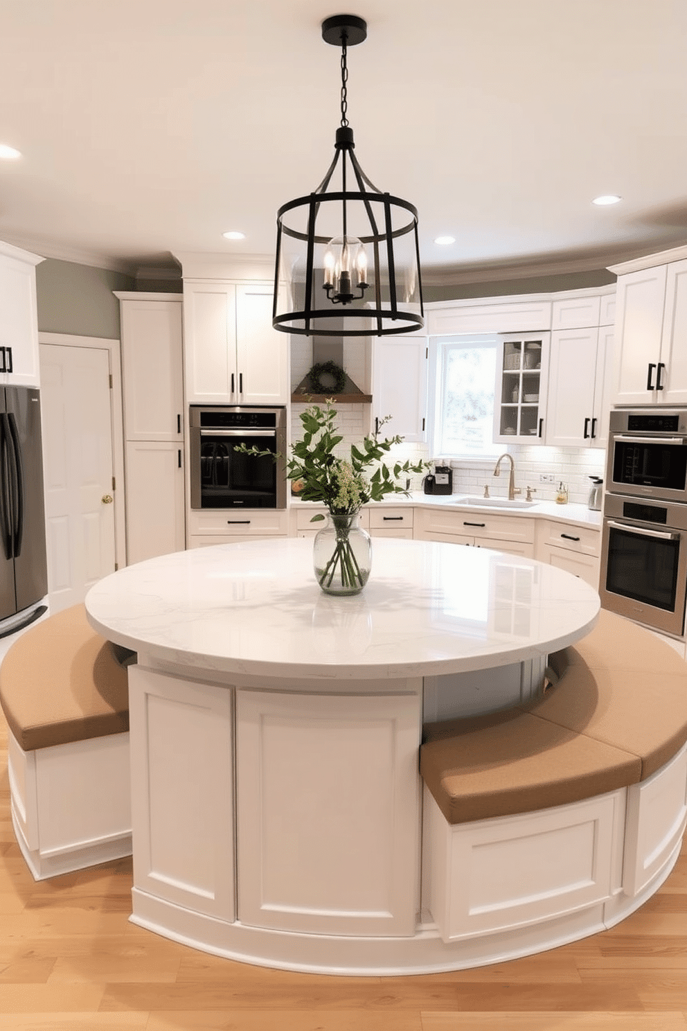 A contemporary kitchen with a circular island as the centerpiece, featuring sleek white cabinetry and a polished quartz countertop. Built-in seating surrounds the island, offering a cozy yet functional space for socializing and casual dining.