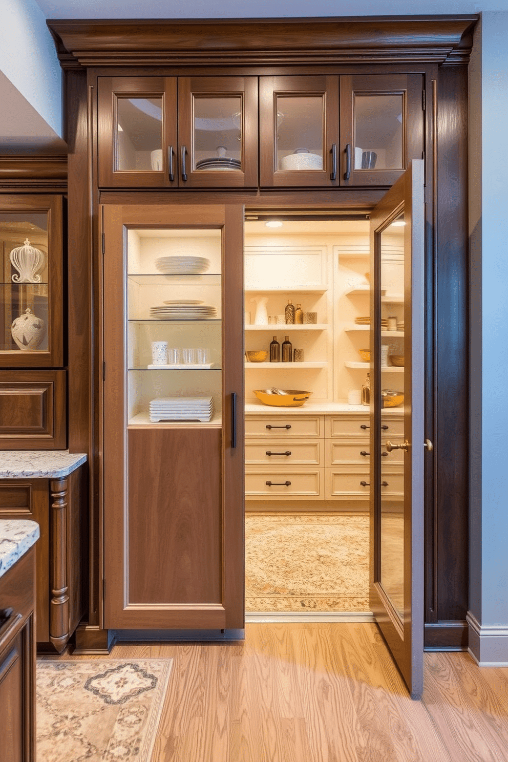 The pantry cabinet design incorporates a combination of wood and glass elements, with pull-out drawers for easy access to ingredients. Soft, warm lighting highlights the organized space, enhancing the inviting atmosphere of the kitchen.