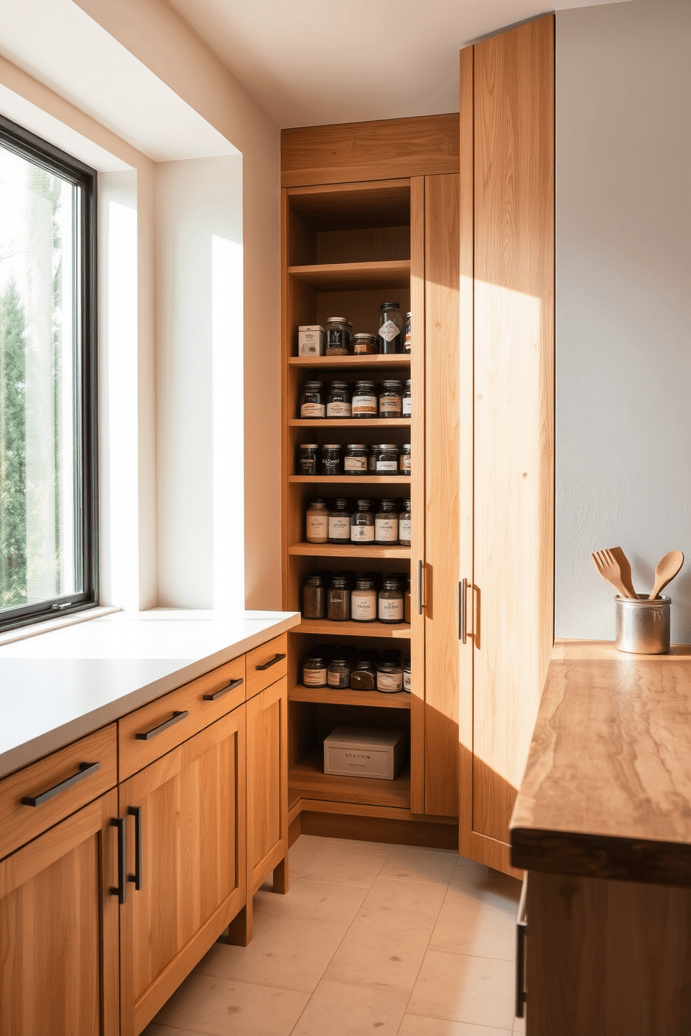 A cozy kitchen pantry featuring a large window that allows natural light to flood the space. The pantry cabinets are crafted from light oak wood, with sleek, modern handles and an open shelving unit displaying neatly organized jars and spices.