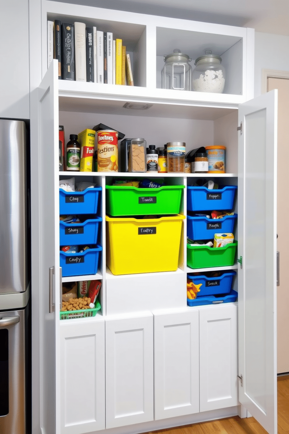 A modern kitchen pantry cabinet featuring color-coded bins for organization. The cabinet has sleek white doors, and inside, vibrant bins in shades of blue, green, and yellow neatly store various dry goods and snacks.