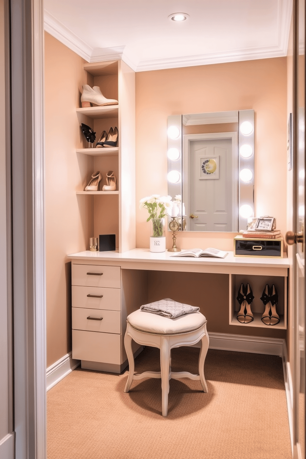 A stylish closet space designed for functionality and aesthetics. It features a small vanity with a sleek mirror and organized makeup storage to the side.