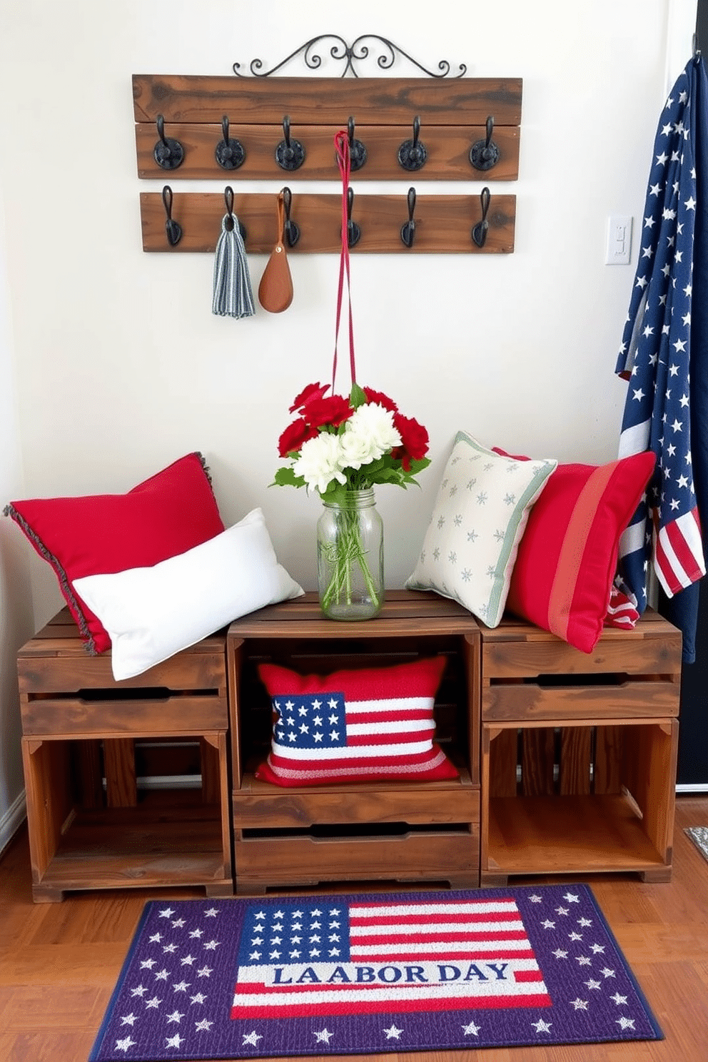For Labor Day, the entryway is adorned with red, white, and blue accents, including a patriotic welcome mat and decorative pillows. Fresh flowers in a mason jar sit atop the crates, creating a welcoming atmosphere for guests.