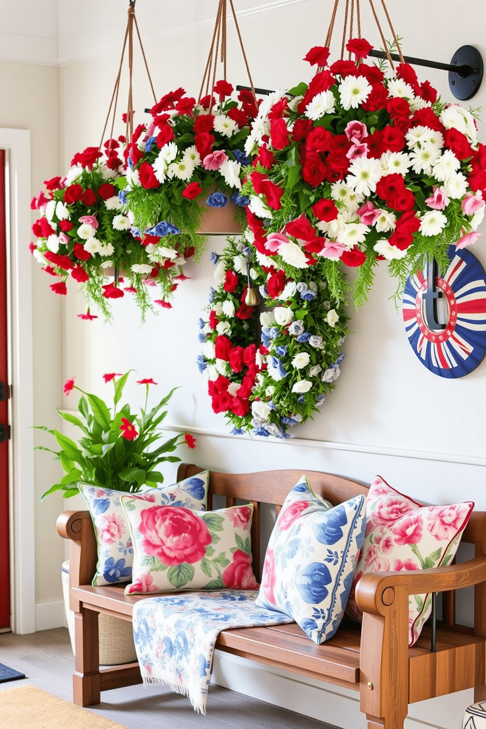 Hanging floral arrangements in red white and blue create a vibrant and welcoming atmosphere. The entryway features a rustic wooden bench adorned with patterned throw pillows that complement the floral theme.