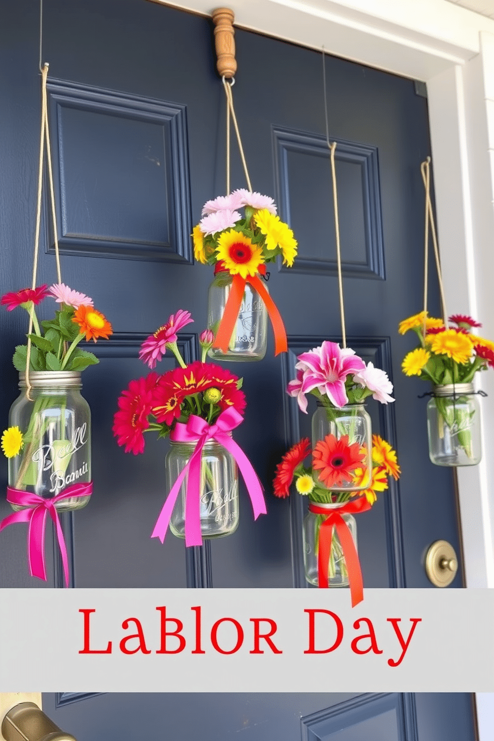 A charming front door adorned with hanging mason jars filled with colorful flowers. The jars are suspended from a rustic wooden beam, creating a welcoming and festive atmosphere for Labor Day.