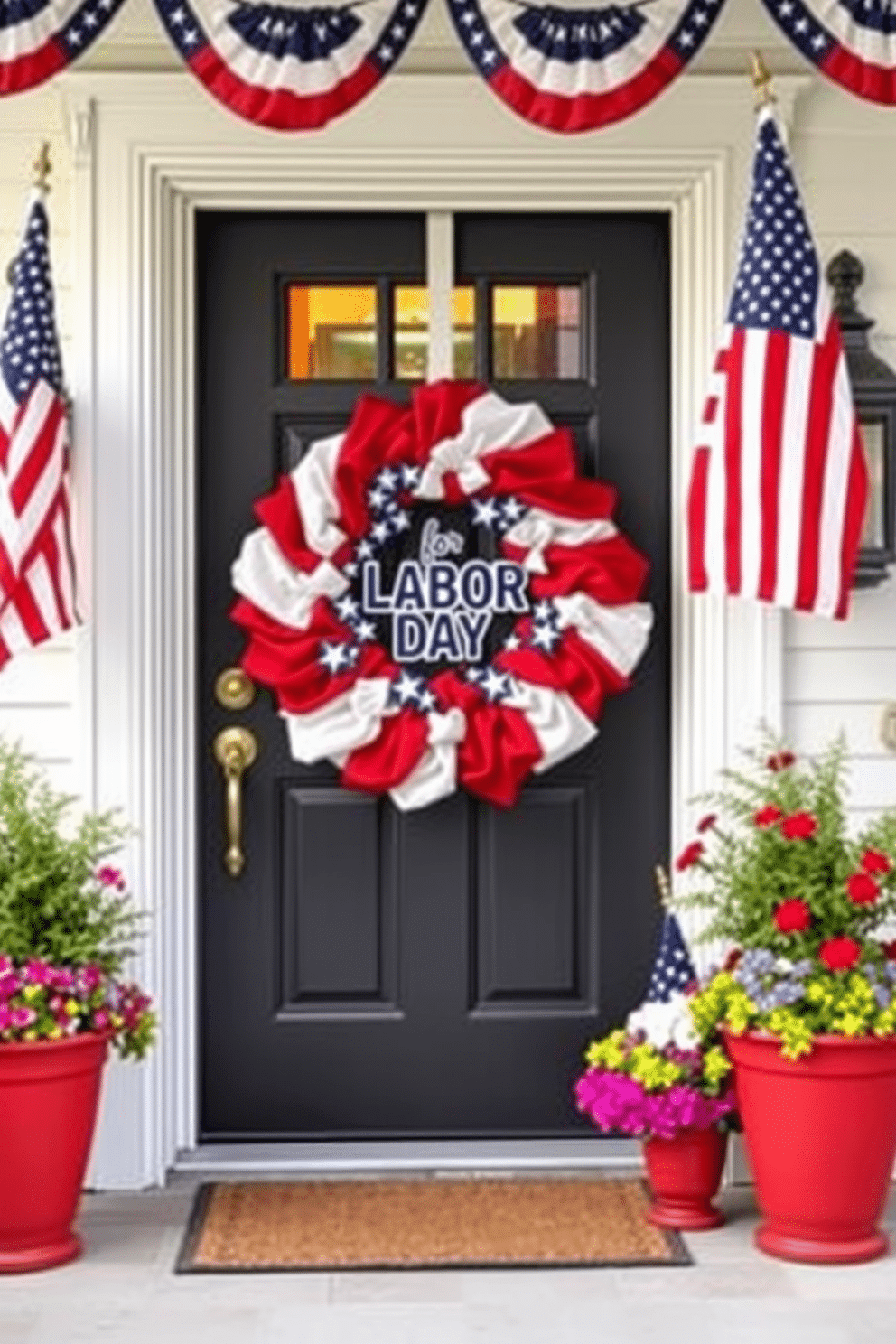 Design a welcoming front door setup for Labor Day, adorned with seasonal decorations such as wreaths and banners. The decor should evoke a festive atmosphere, inviting guests to celebrate the holiday in style.