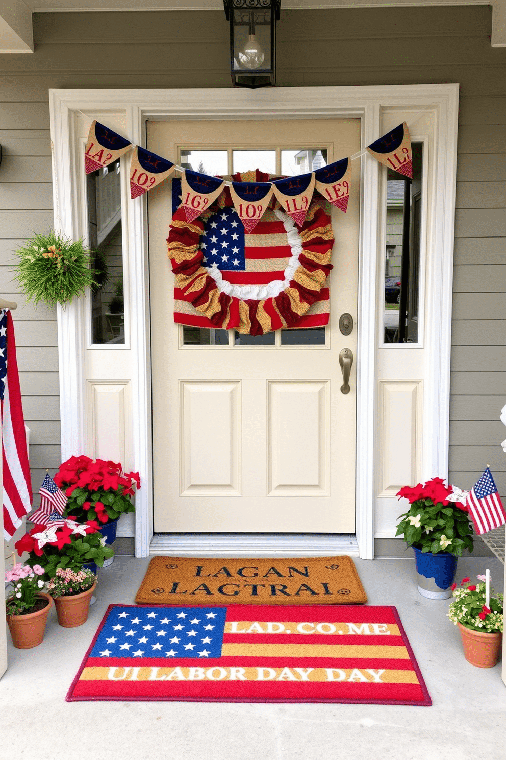 A welcoming front entryway features a vibrant American flag door mat that adds a patriotic touch. Surrounding the door mat, seasonal decorations celebrate Labor Day with colorful banners and small potted plants in red, white, and blue hues.