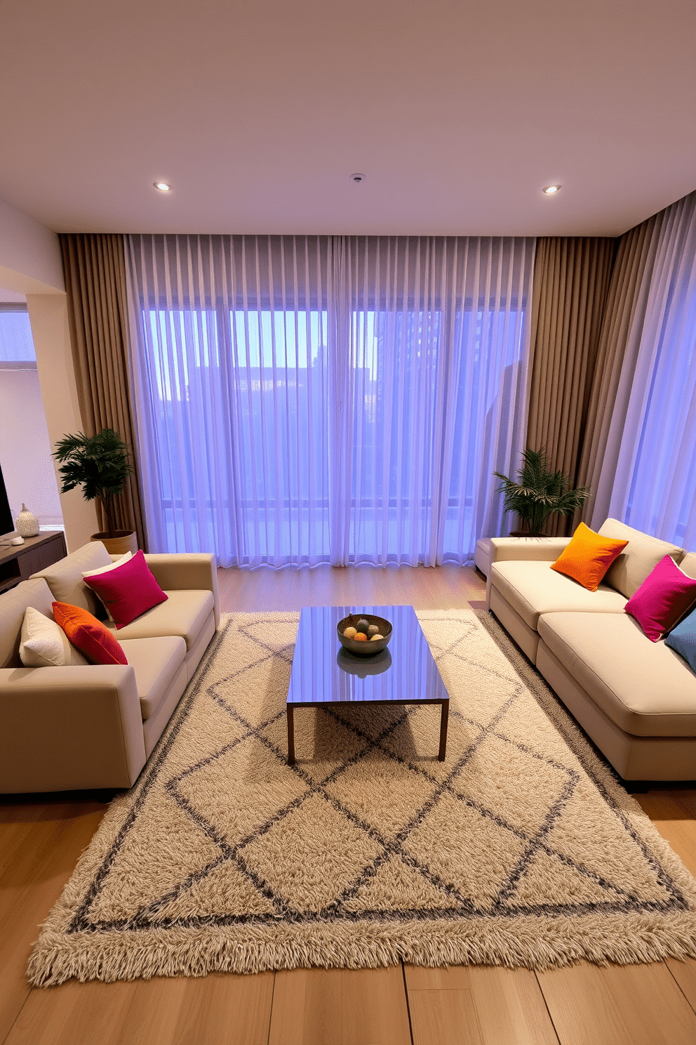 The room is anchored by a large sectional sofa in a soft, neutral fabric, complemented by colorful throw pillows. A stylish coffee table sits in the center, surrounded by a cozy area rug that adds warmth to the space.