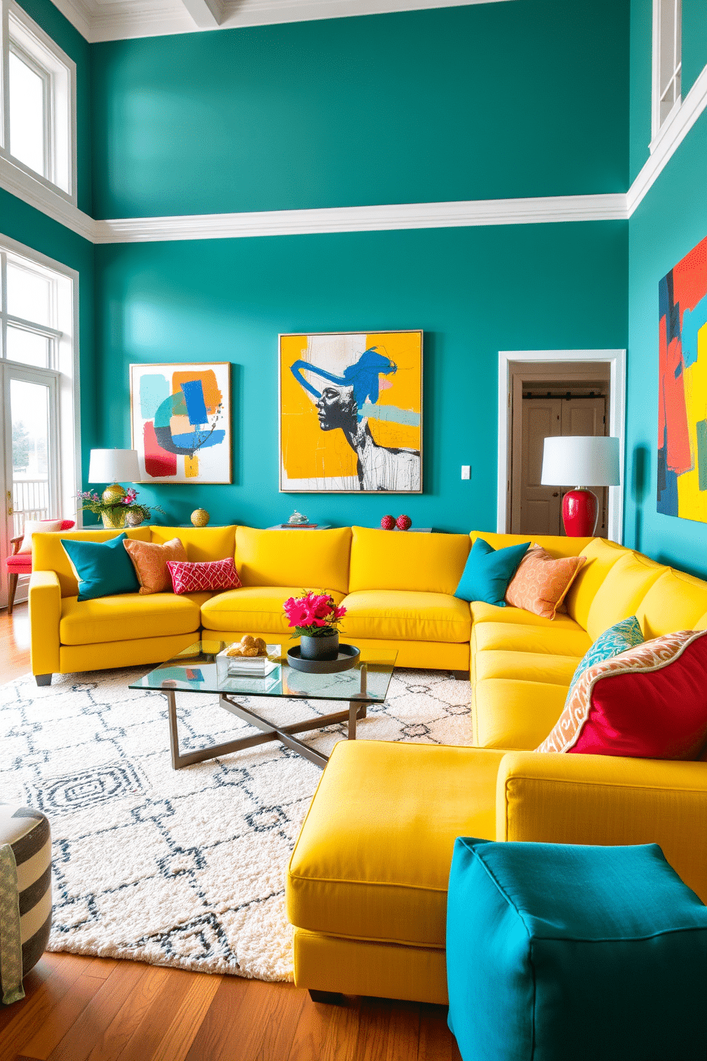 A spacious sectional sofa in a sunny yellow is arranged around a sleek glass coffee table. Colorful throw pillows and a plush area rug with geometric patterns enhance the lively atmosphere of the room.