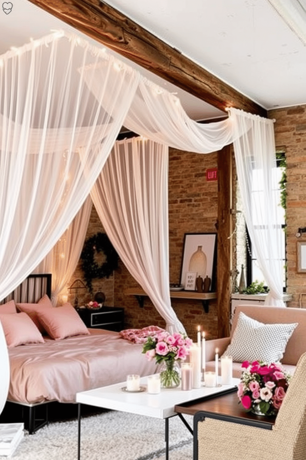 For a loft setting, Valentine’s Day decorations include a mix of rustic and modern elements. Heart-shaped garlands hang from exposed beams, while a cozy seating area features a chic coffee table adorned with candles and fresh flowers, inviting warmth and romance.