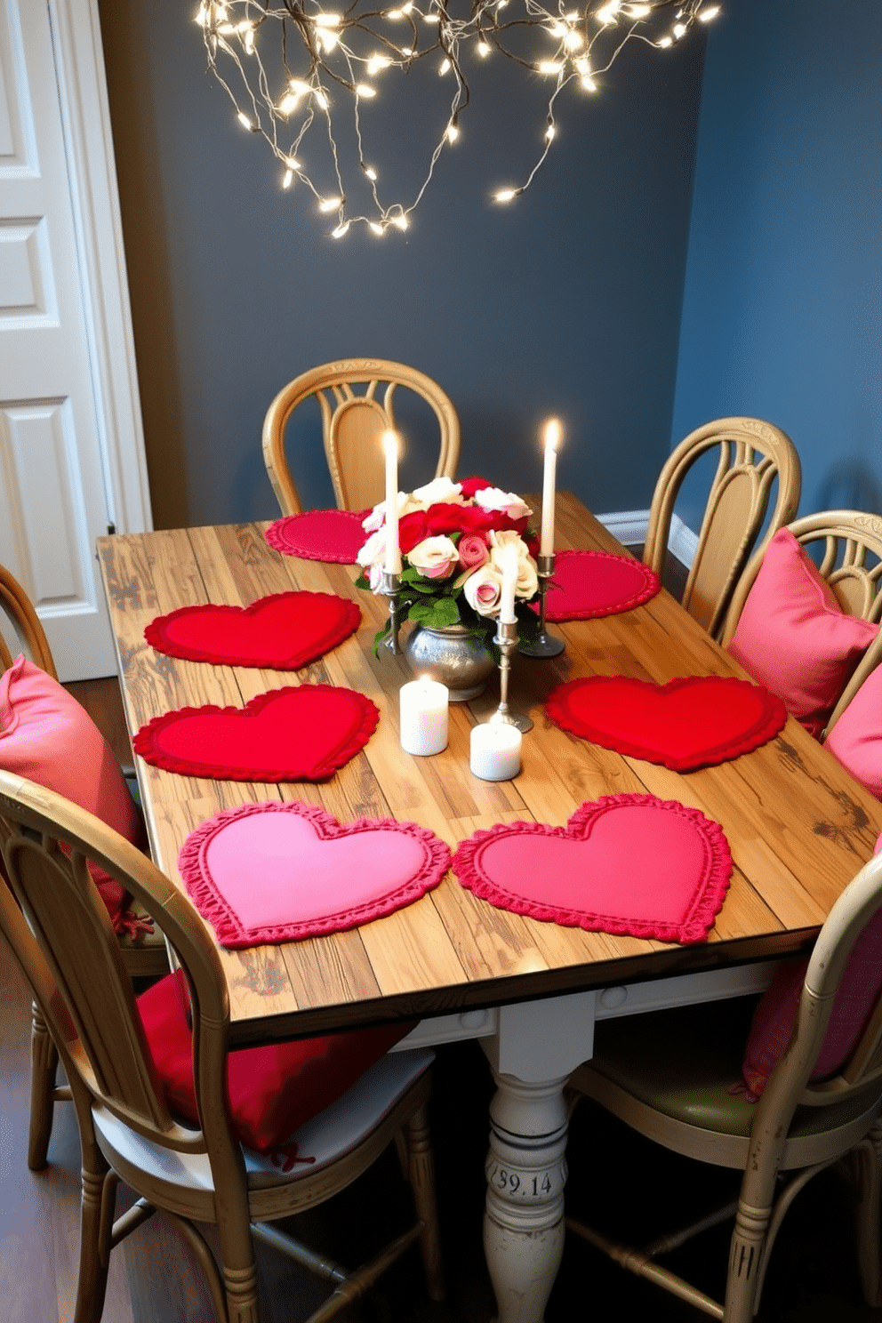 Heart-shaped placemats are elegantly arranged on a rustic wooden dining table, adding a touch of romance to the setting. Surrounding the table are mismatched vintage chairs, each adorned with soft cushions in shades of red and pink.
