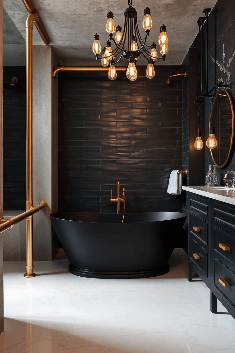 An industrial-chic vibe with exposed brass pipes running along the walls, acting as both functional and design elements. The walls are a mix of raw concrete and deep charcoal tiles, with warm Edison bulb lighting suspended from black metal fixtures nearby.