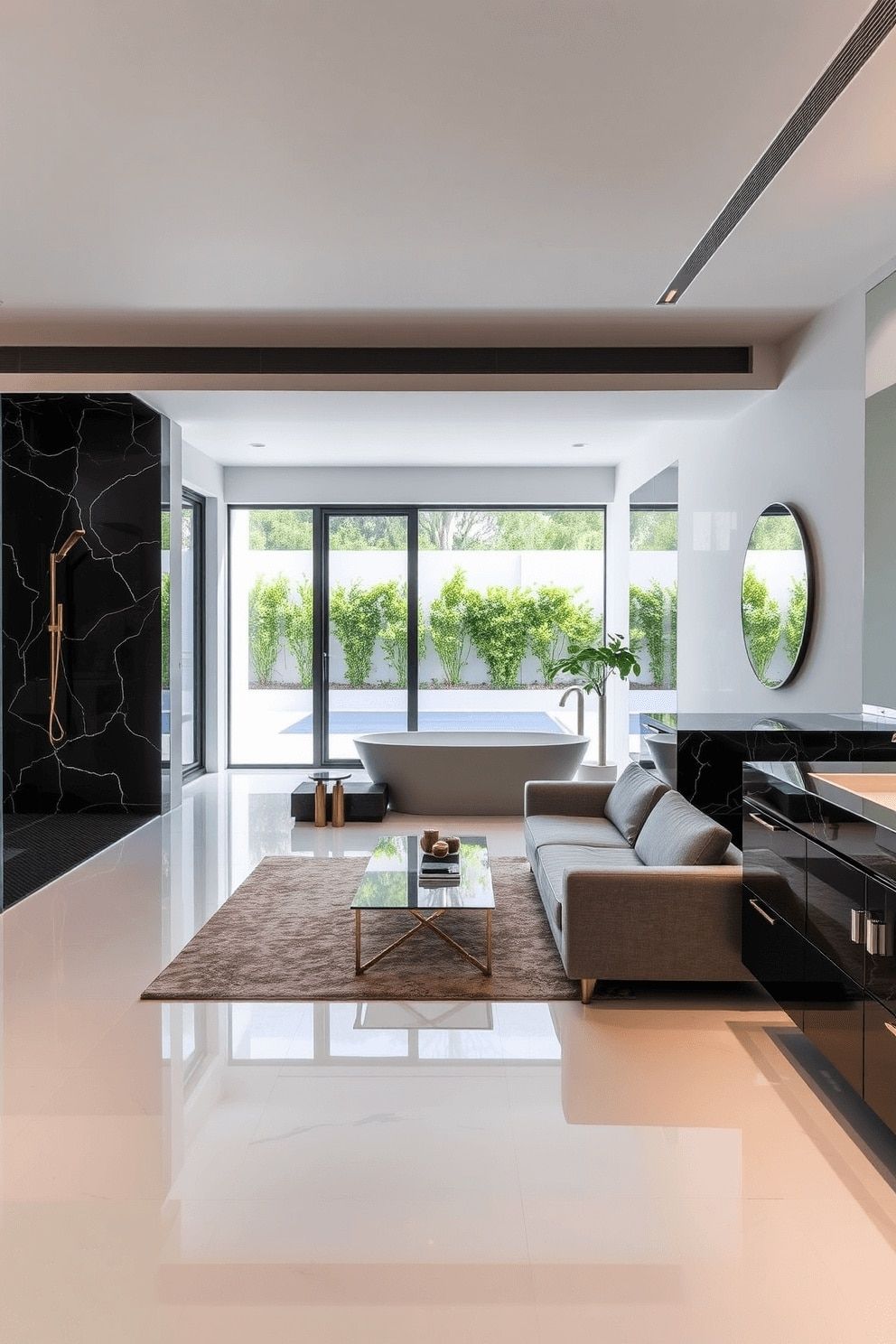 A statement freestanding bathtub rests on a polished stone floor, surrounded by subtle gold and matte black fixtures. A floating wooden vanity with a smooth marble countertop complements the room, paired with oversized mirrors and lush greenery for a serene, high-end aesthetic.