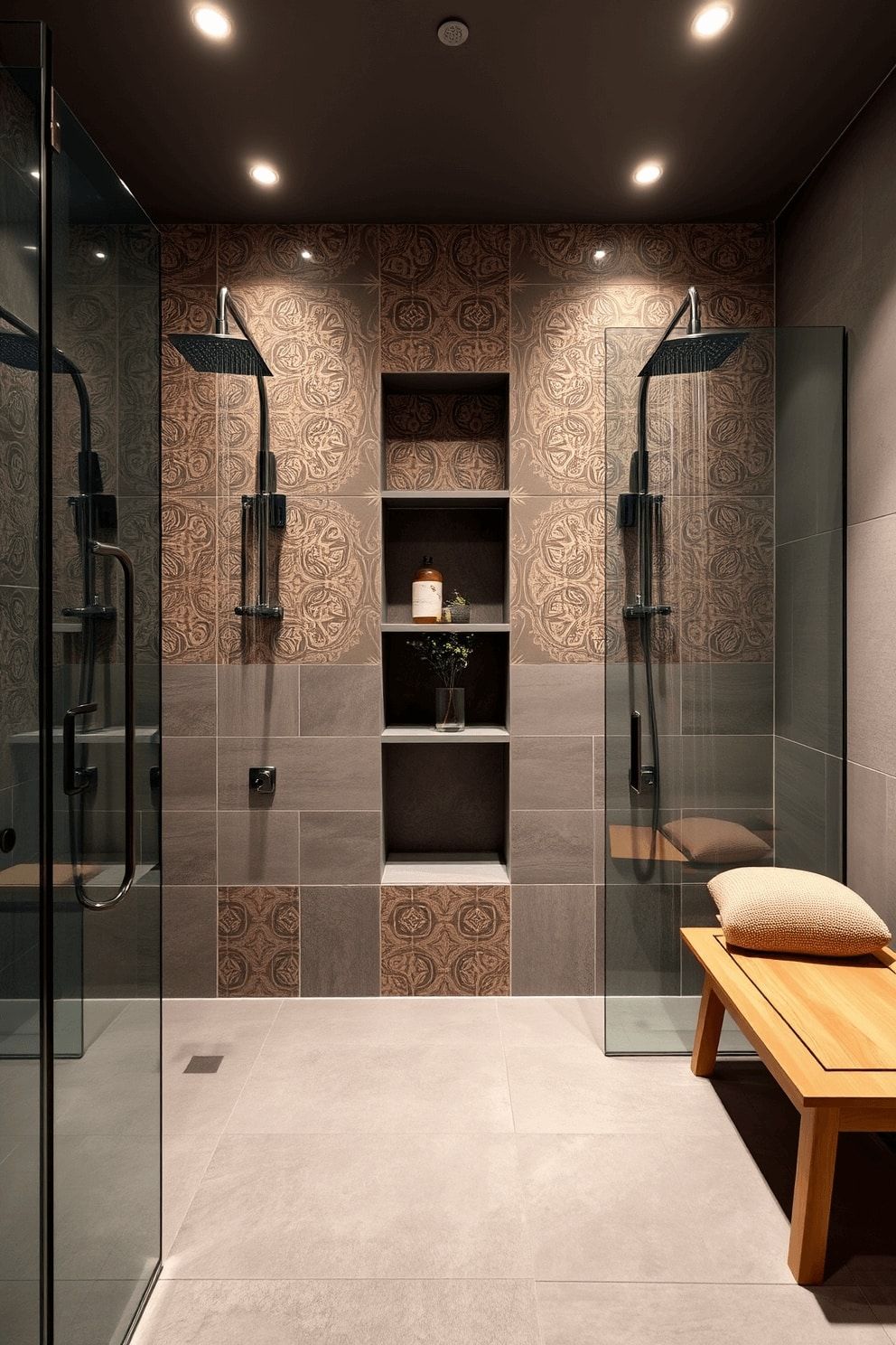 Between the showers, a minimalistic recessed shelf holds elegant toiletries and a small potted plant. Soft recessed lighting overhead casts a gentle glow, while a plush bench in natural wood is placed at the side for convenience and style.