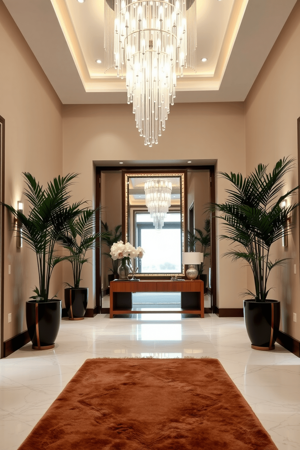 A statement console table sits against one wall, topped with decorative accessories and a large mirror that reflects the opulence of the space. Flanking the entrance, tall potted plants bring a touch of nature indoors, enhancing the luxurious atmosphere.