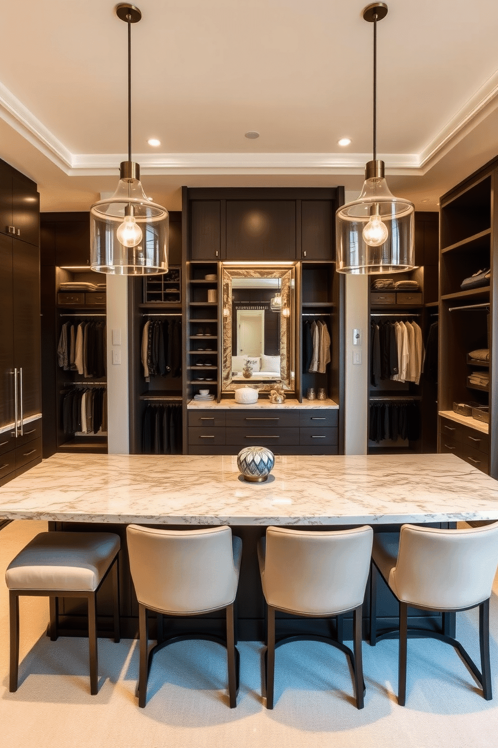 A central island with a marble top provides additional storage and display space for accessories. Elegant lighting fixtures hang above, illuminating the organized space and creating a luxurious atmosphere.