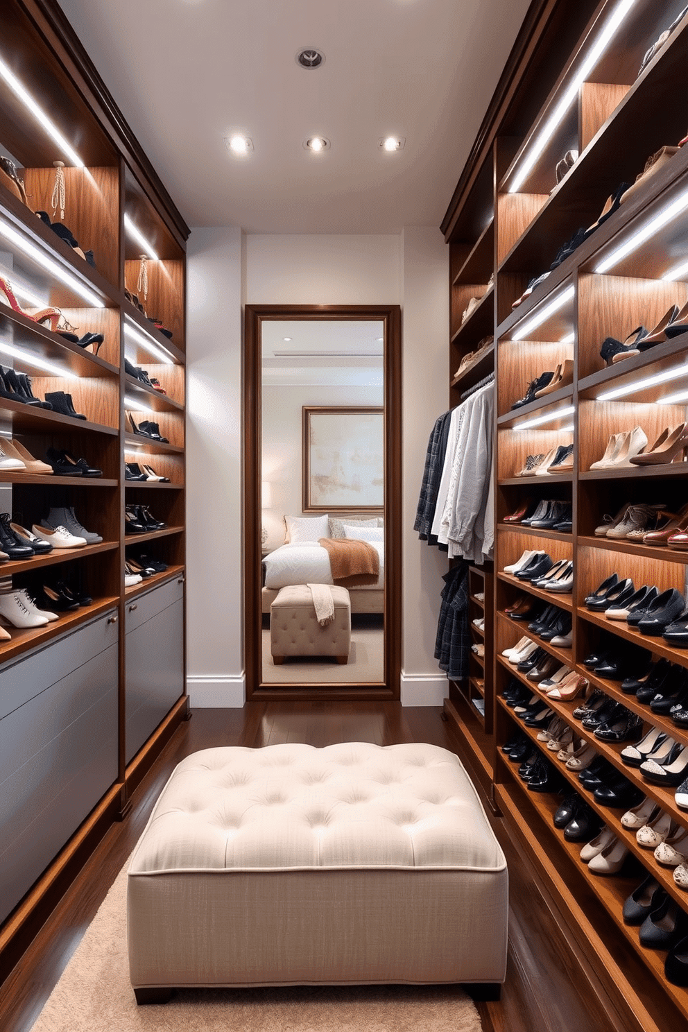 A stylish walk-in closet designed for shoe display features custom shelving that showcases an array of footwear in an organized manner. The shelves are crafted from rich walnut wood, with soft LED lighting highlighting each pair, creating an inviting atmosphere.