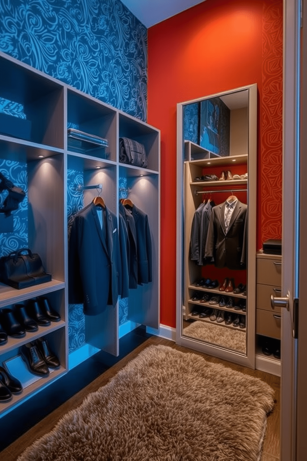 The closet features a combination of open and closed storage solutions, with tailored suits displayed prominently alongside neatly organized shoes. Soft, ambient lighting enhances the rich colors of the wallpaper, while a full-length mirror adds functionality and elegance to the space.