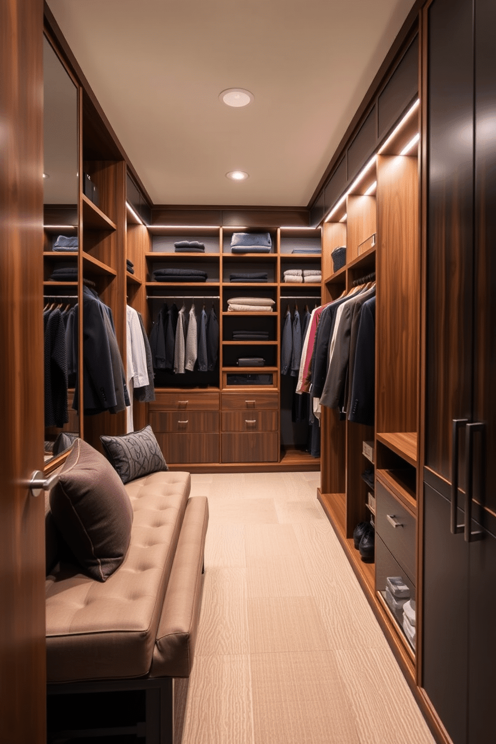 A stylish walk-in closet designed for men, featuring corner seating for dressing convenience. The space includes built-in shelves and hanging racks, with a sleek, modern aesthetic that incorporates rich wood finishes and soft ambient lighting.