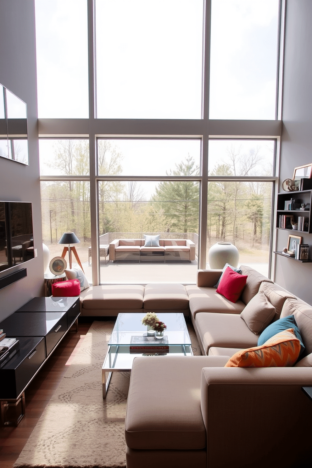 A modern family room featuring large floor-to-ceiling windows that flood the space with natural light. The room includes a plush sectional sofa in a neutral tone, accented by colorful throw pillows, and a sleek coffee table made of glass and metal.