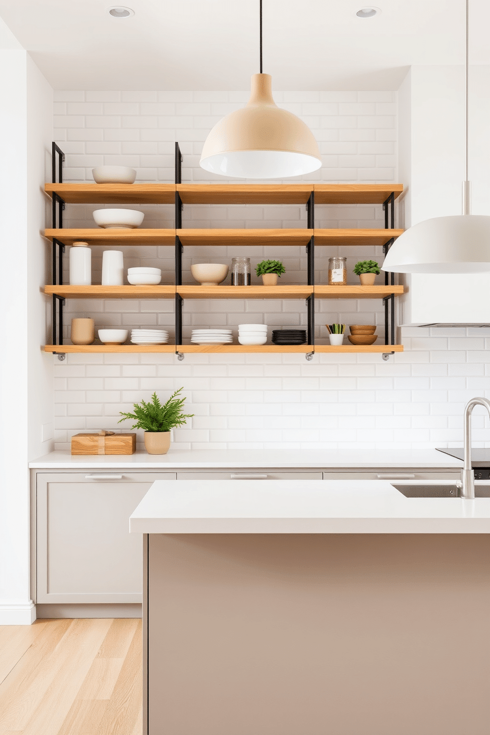 Above the counter, open wooden shelves showcase ceramic kitchenware in neutral tones, while pendant lights with simple shapes hang delicately from the ceiling. The flooring is a warm natural oak, complemented by subtle textured white subway tiles on the backsplash, bringing together a serene yet functional aesthetic.