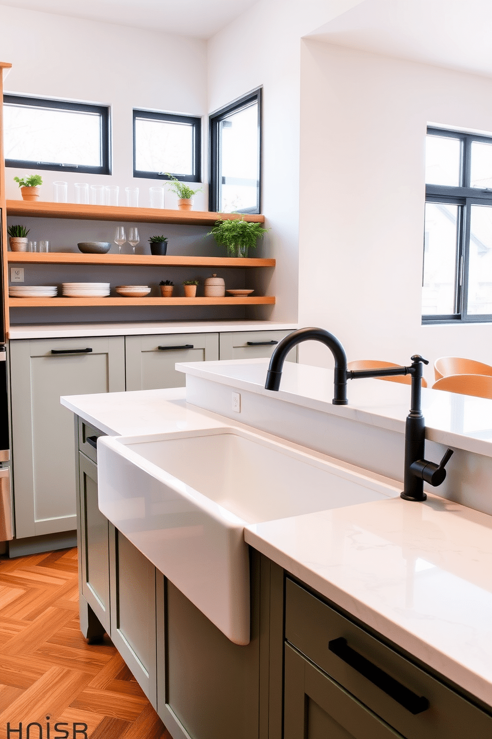 A contemporary kitchen showcasing an oversized farmhouse sink at its center, paired with sleek, matte black modern faucets that contrast beautifully against the pristine white ceramic surface. Surrounding the sink is a polished quartz countertop with soft veining, complemented by natural wood cabinetry painted in a calming sage green tone.