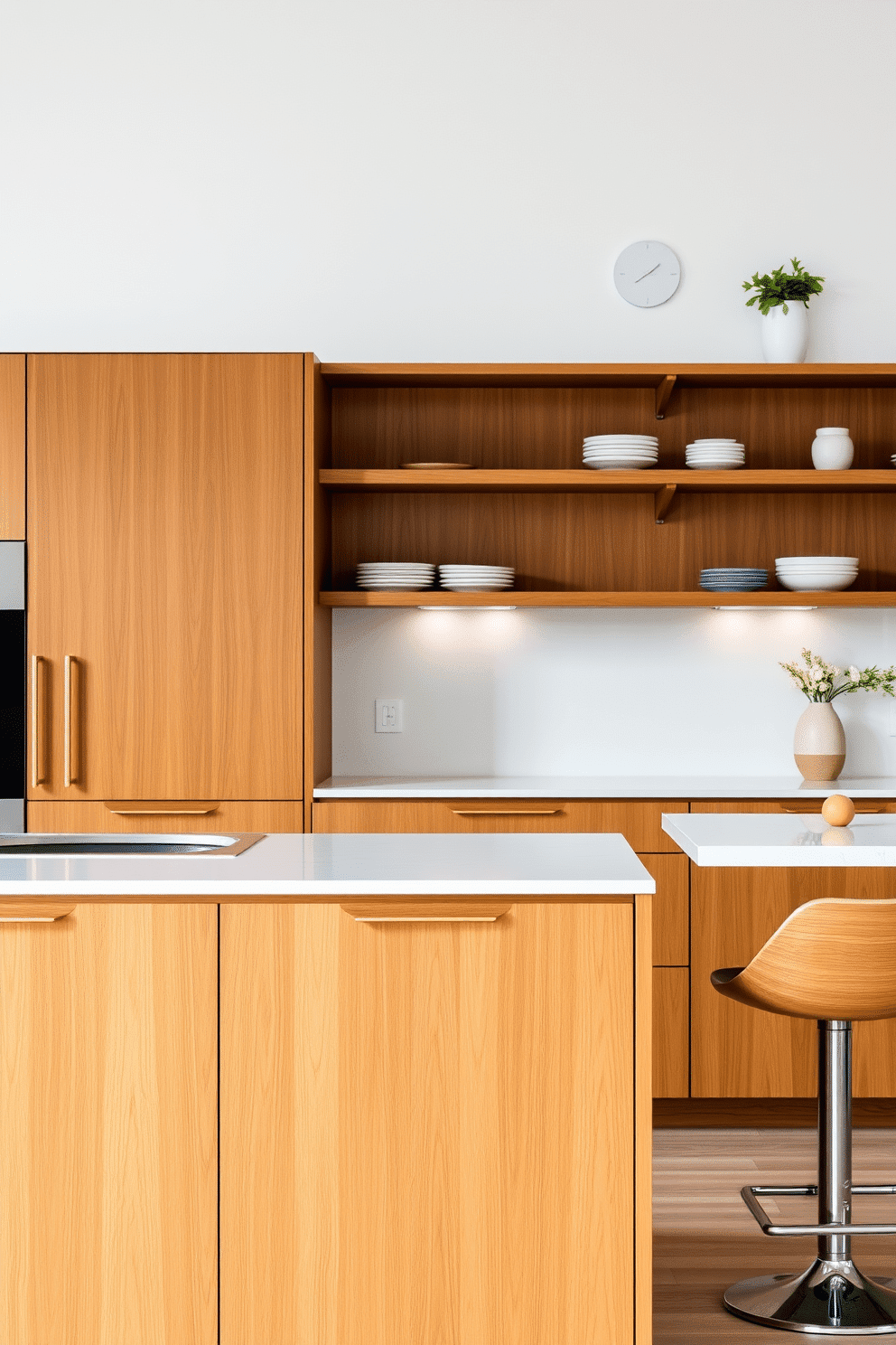 Above the countertops, minimalist open shelving displays curated ceramic dishes and subtle greenery, adding a touch of warmth. The kitchen island boasts matching wood accents, complemented by contemporary bar stools with soft upholstered seats.