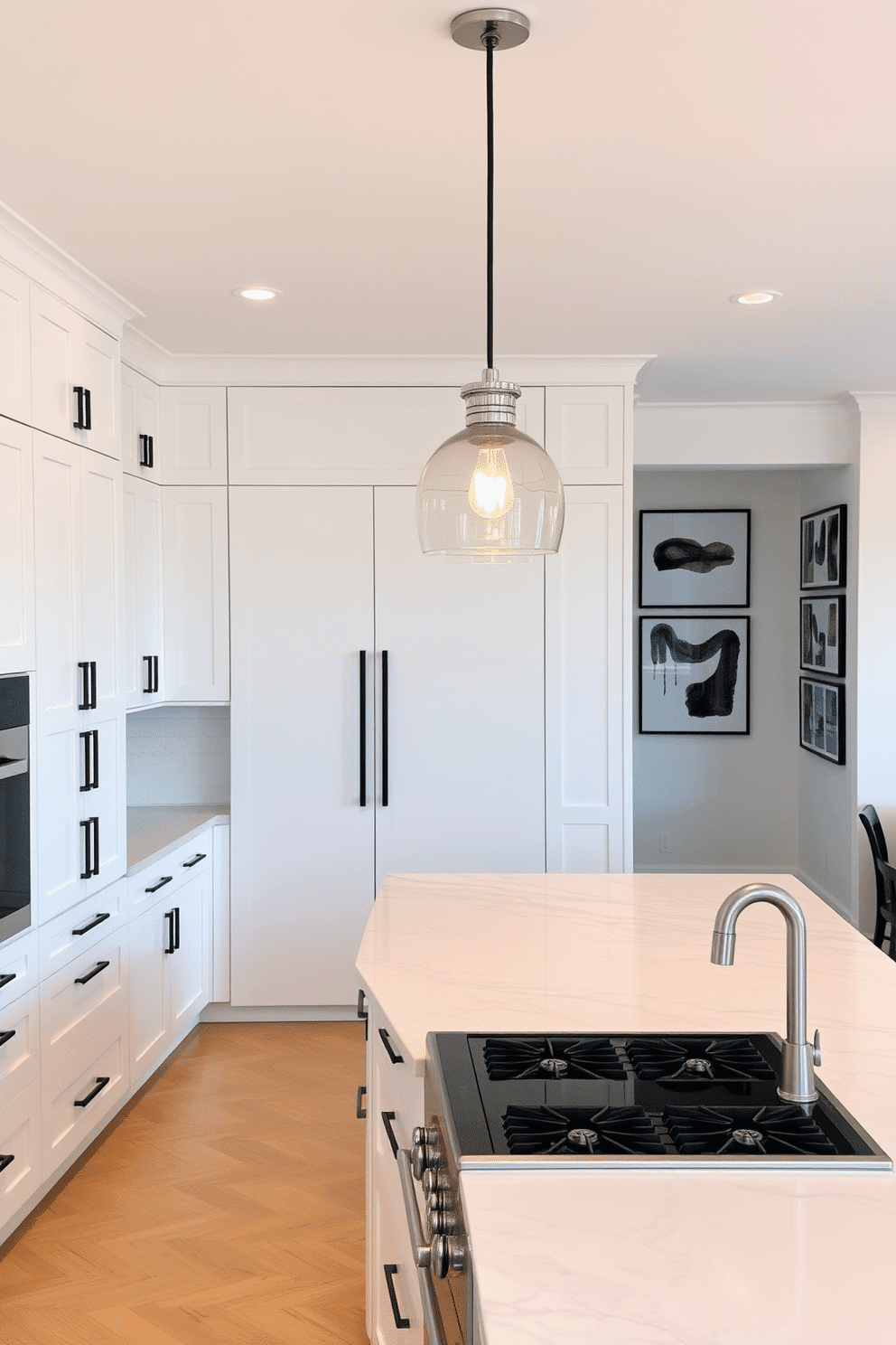 Above the island, two pendant lights with clear glass shades illuminate the space, adding a warm glow. A curated collection of framed abstract art adorns one wall, bringing in a personal and artistic touch to balance the clean and minimalist aesthetic.