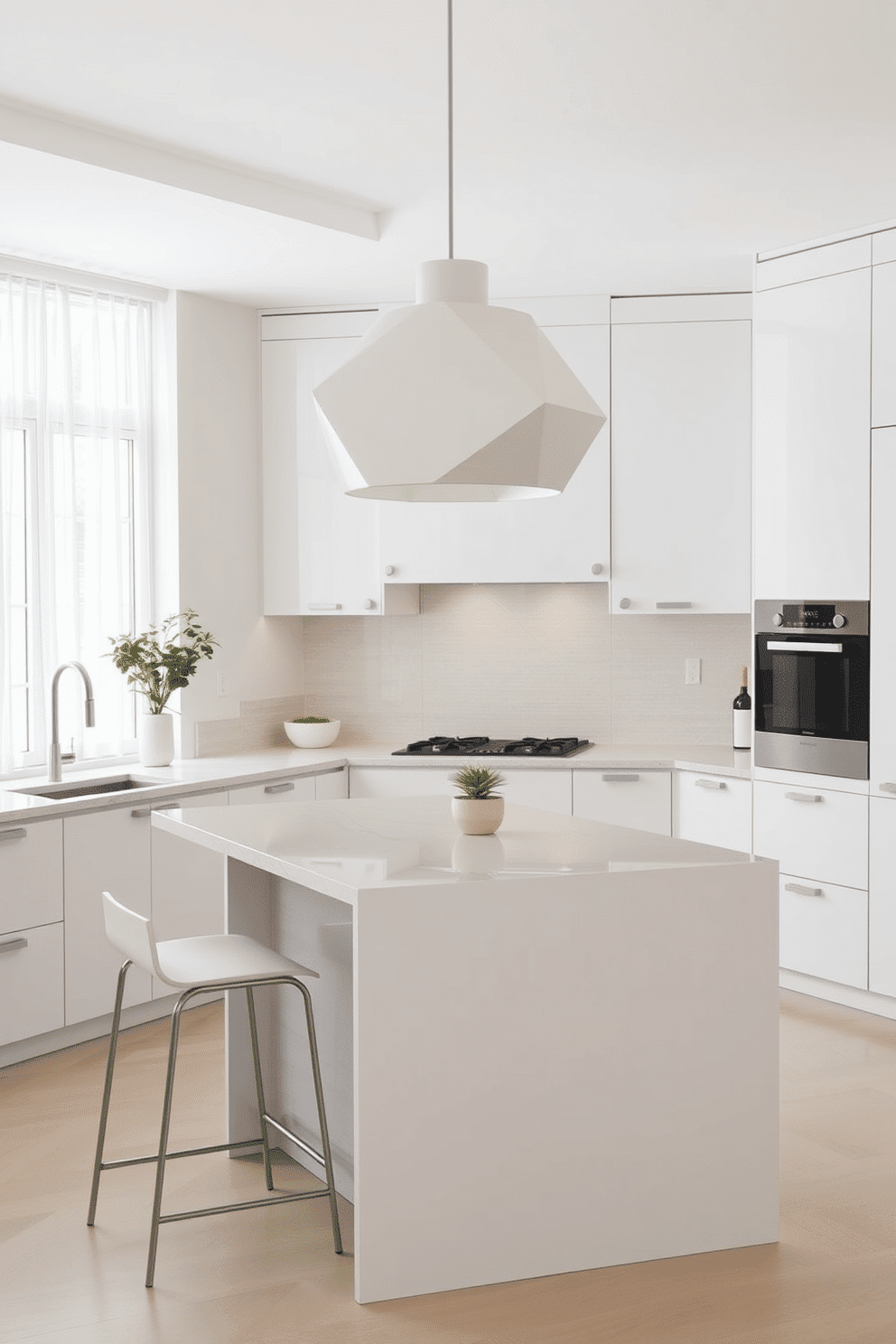 Above the island, a striking, oversized sculptural pendant light serves as the bold centerpiece. The backsplash features subtle textured tiles, and natural light streams in through large windows framed with sheer white curtains.