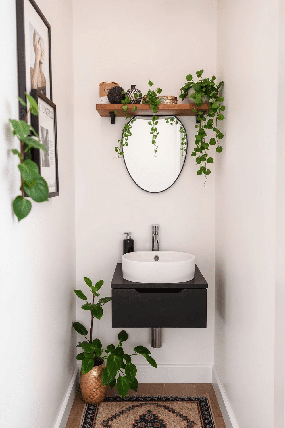 Above the sink, a stylish round mirror with a decorative frame reflects the ambient light. A small shelf holds decorative items, while a potted plant in the corner brings a touch of greenery to the compact area.