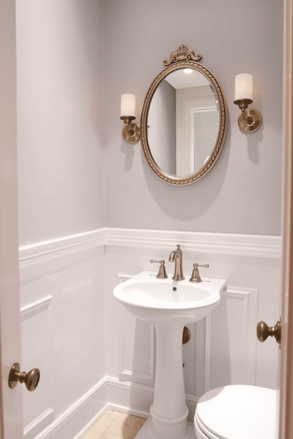 A narrow powder room features a half-wall that separates the toilet area from the sink space, enhancing privacy while maintaining an open feel. The walls are adorned with a soft, light gray paint, complemented by elegant wainscoting in a crisp white.