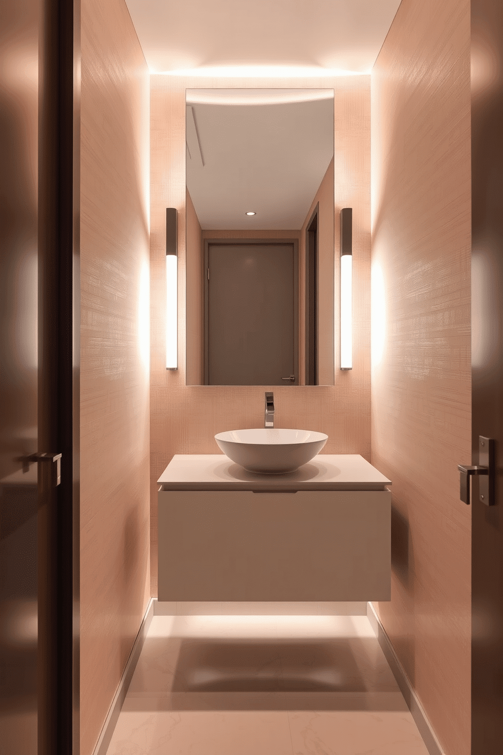 A narrow powder room features sleek, wall-mounted lighting that illuminates the space with a warm glow. The walls are adorned with a textured wallpaper in a soft hue, creating an inviting atmosphere while maximizing the room’s vertical space.