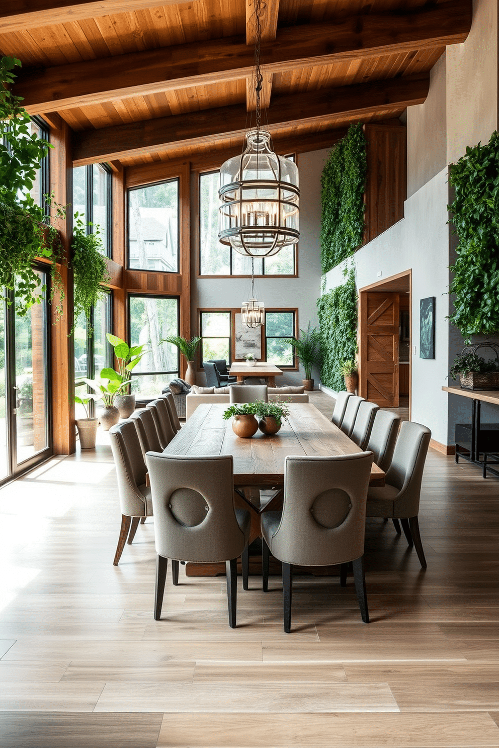A nature-inspired dining room features a large wooden table surrounded by upholstered chairs in earthy tones. Lush greenery accents the space with hanging plants and a vertical garden on one wall, creating a fresh and inviting atmosphere.