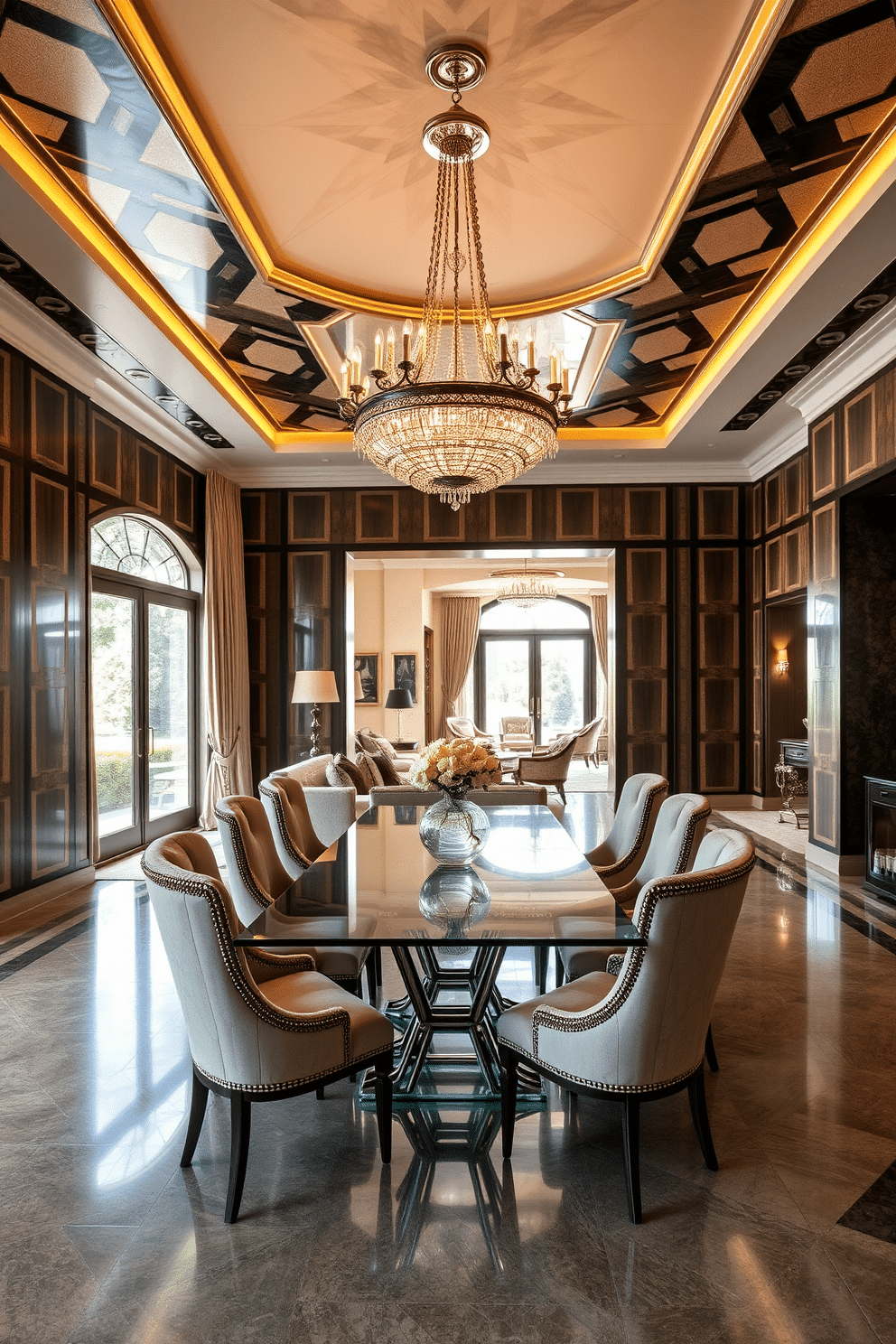 A luxurious Art Deco dining room featuring bold geometric patterns on the walls and ceiling. The dining table is a sleek glass piece surrounded by upholstered chairs with intricate detailing, while a stunning chandelier hangs above, casting a warm glow.