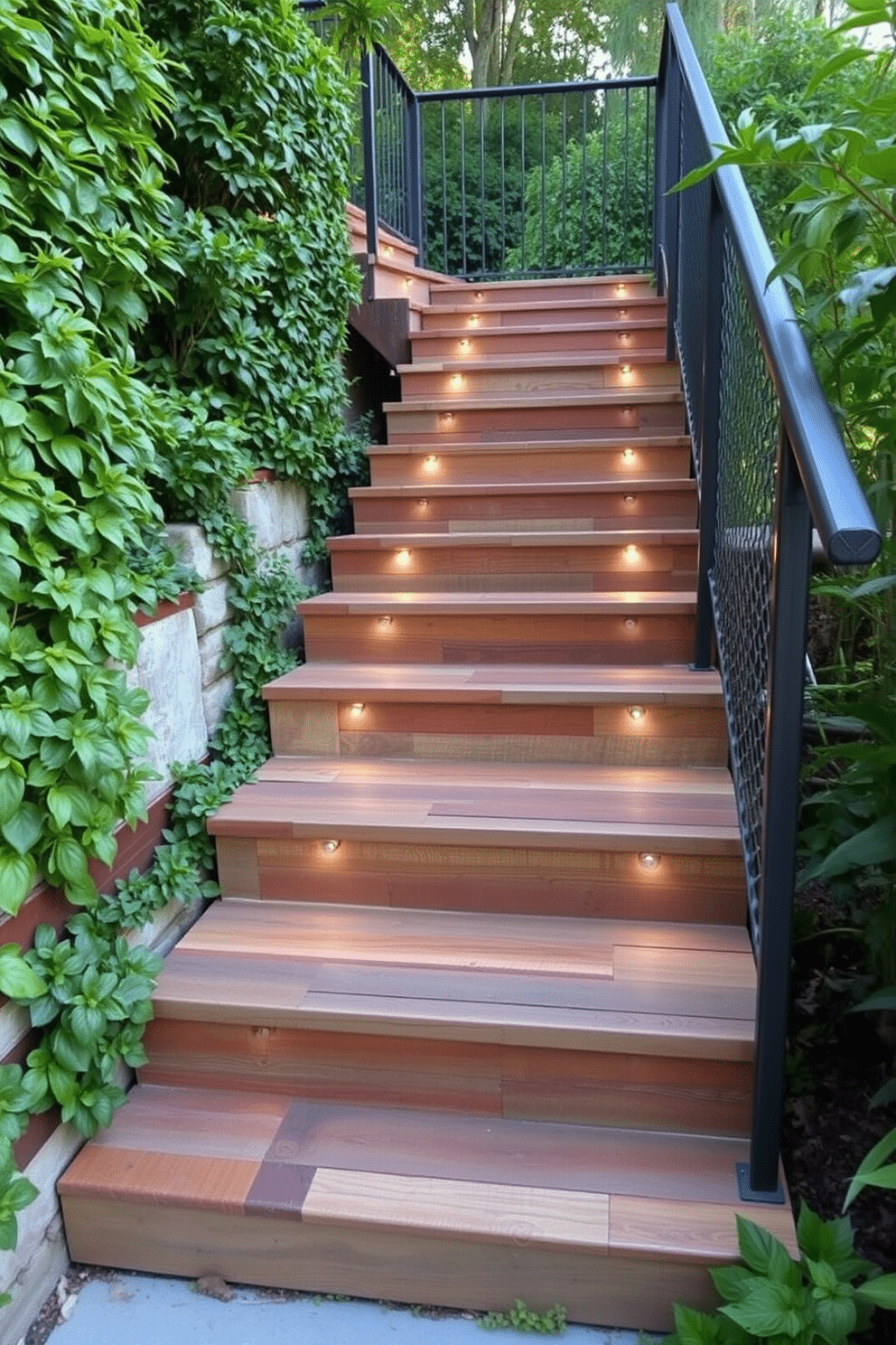 Illuminated plank wood stairs with integrated LED lighting for enhanced safety feature a sleek design that complements the surrounding landscape. The stairs are surrounded by lush greenery, with handrails crafted from natural wood to provide a warm and inviting touch.