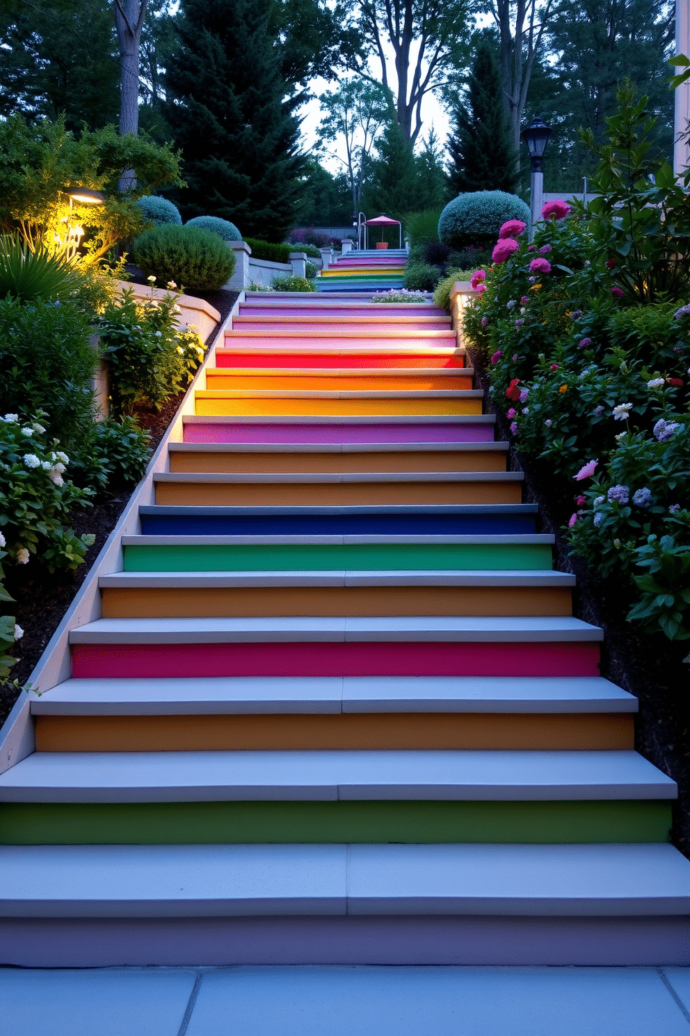 A stunning outdoor staircase features a series of colorful risers that create a vibrant contrast against the natural surroundings. The steps are made of smooth stone, leading up to a beautifully landscaped garden filled with lush greenery and blooming flowers.