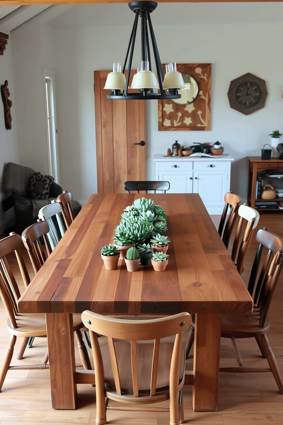 A rustic dining room features a large wooden table made from reclaimed barn wood, surrounded by mismatched chairs that add character. On the table, succulent plants in terracotta pots serve as vibrant centerpieces, bringing a touch of greenery to the warm, earthy tones of the space.