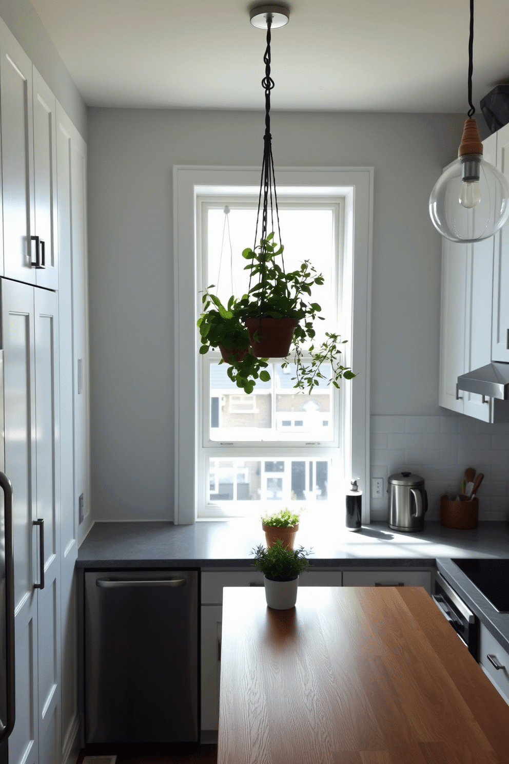 A cozy kitchen corner with a bright window basking in natural light. Suspended from sleek black rods, small terracotta planters overflow with basil, mint, and rosemary, creating a vibrant hanging herb garden that doubles as decor.