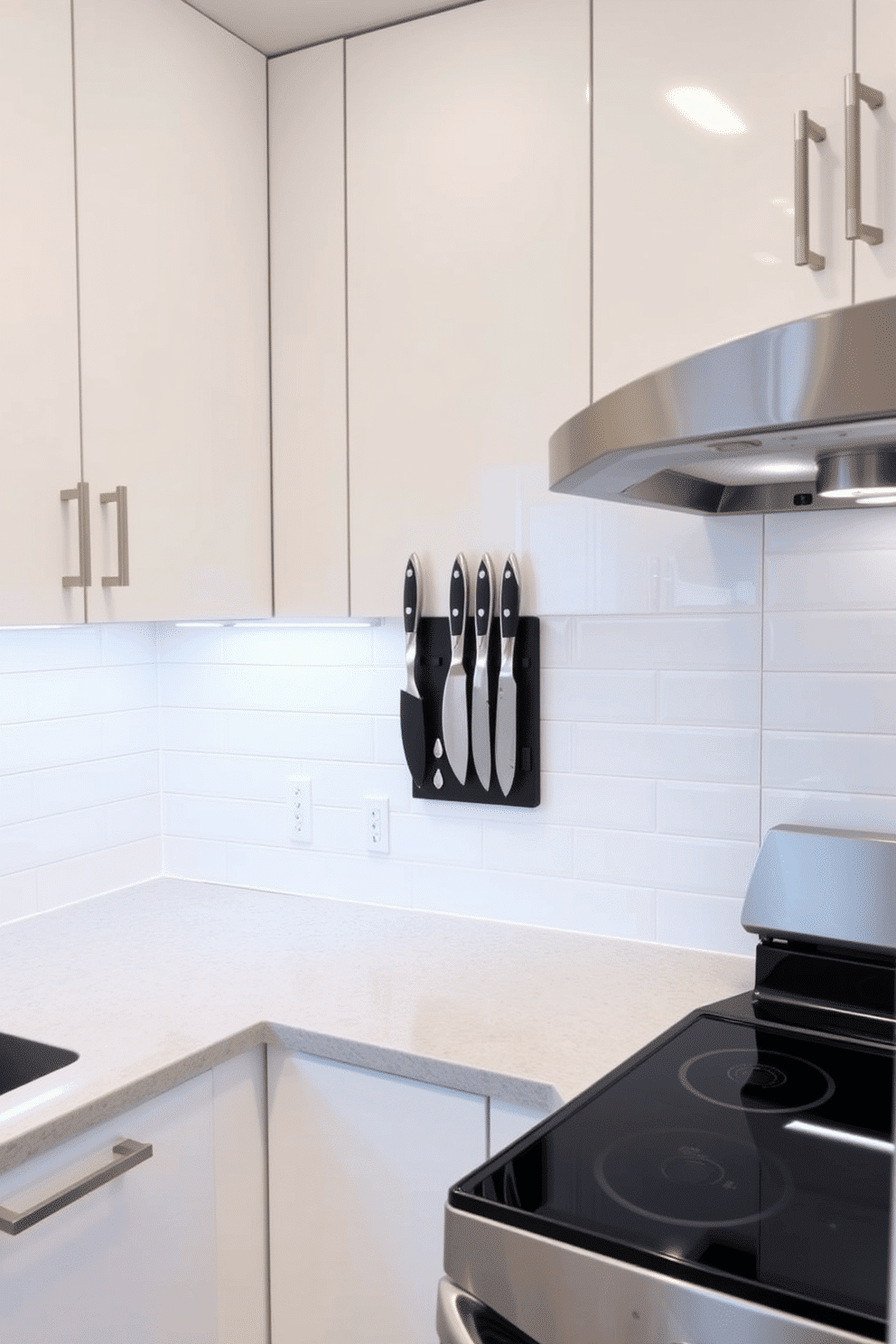 A vertical wall-mounted magnetic knife holder in matte black is positioned near the stove for convenience, showcasing a set of stainless steel knives. Subway tile backsplash in glossy white and under-cabinet LED lighting further enhance the minimalist yet functional aesthetic.
