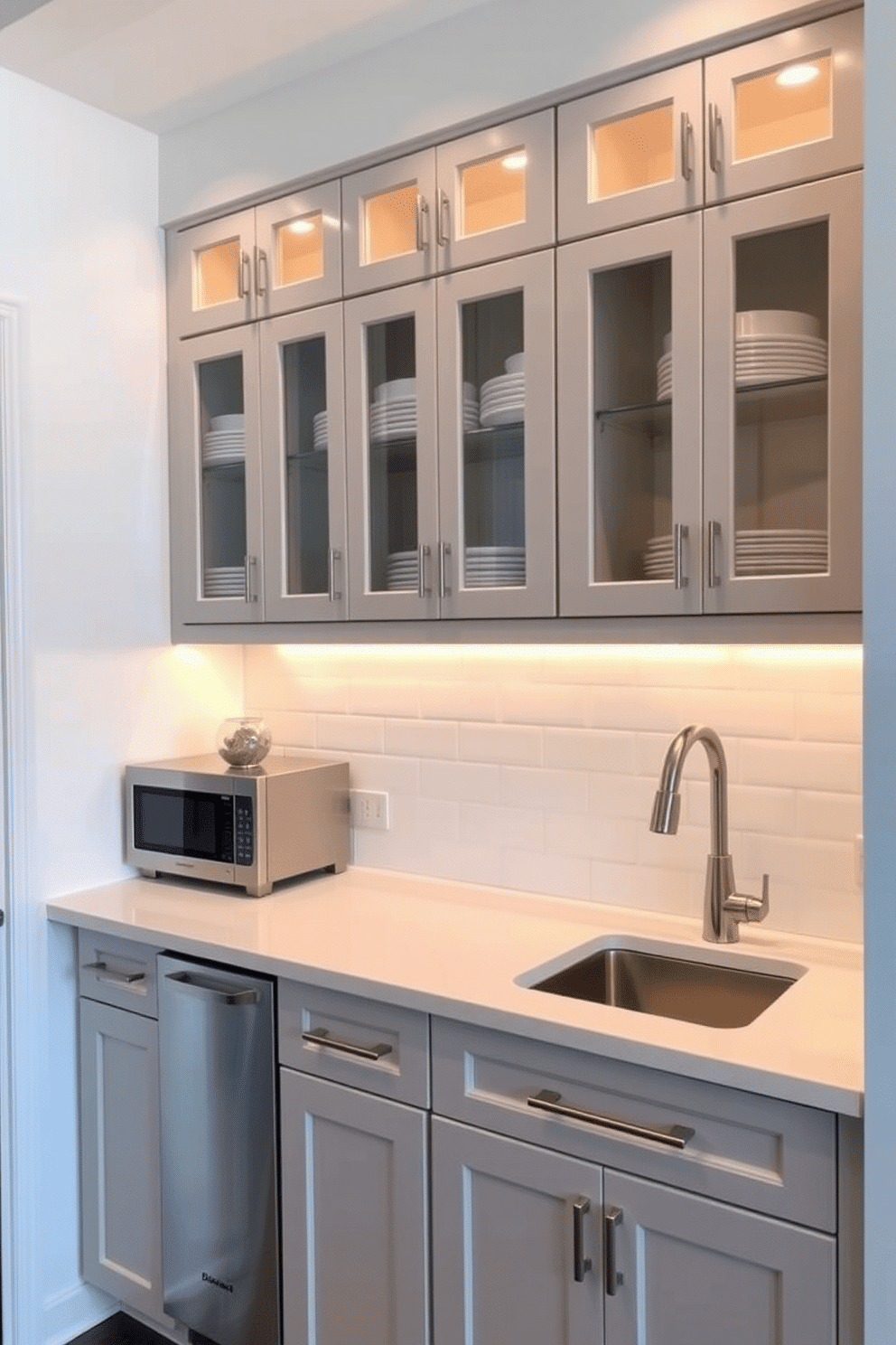 The cabinets are finished in a soft dove gray, paired with a white quartz countertop and a sleek subway tile backsplash. Warm under-cabinet lighting highlights the clean lines and modern hardware, creating a well-lit and inviting kitchen perfect for limited spaces.