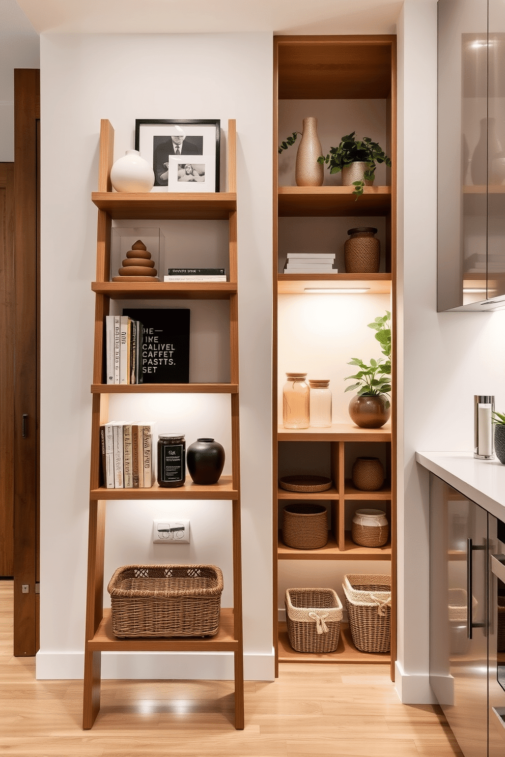 The space is illuminated by warm, ambient lighting, highlighting the rich wood tones of the cabinetry. A small ladder leans against the shelves, adding a charming element while providing easy access to the upper storage areas.