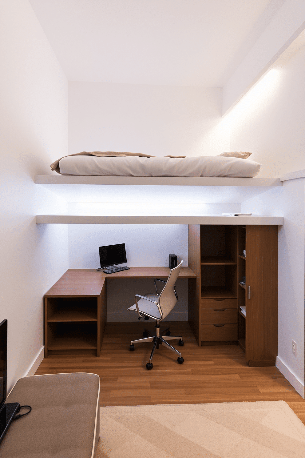 A modern studio loft apartment featuring a floating bed frame that creates an airy and minimalist aesthetic. The bed appears to hover above the floor, with integrated LED lighting beneath it for a sleek and futuristic touch.