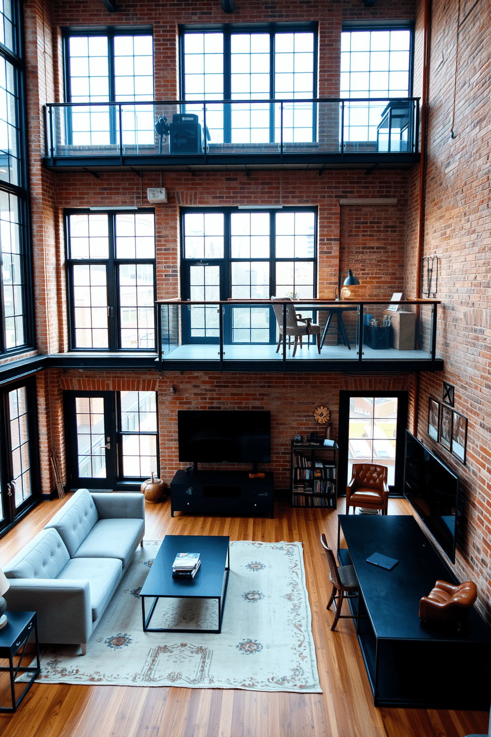 An industrial chic living room with high ceilings and exposed brick walls, complemented by large black-framed windows that let in an abundance of natural light. A sleek gray sectional sofa sits atop a distressed area rug, facing a minimalist black metal coffee table and a mounted flat-screen TV with a clean black console below.