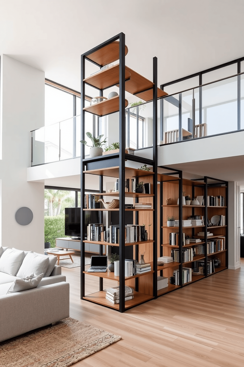 A modern two-story apartment features sleek room dividers that double as custom book shelving. The dividers are crafted from warm, natural wood with black metal accents, creating a functional yet stylish space for displaying books, plants, and decor.