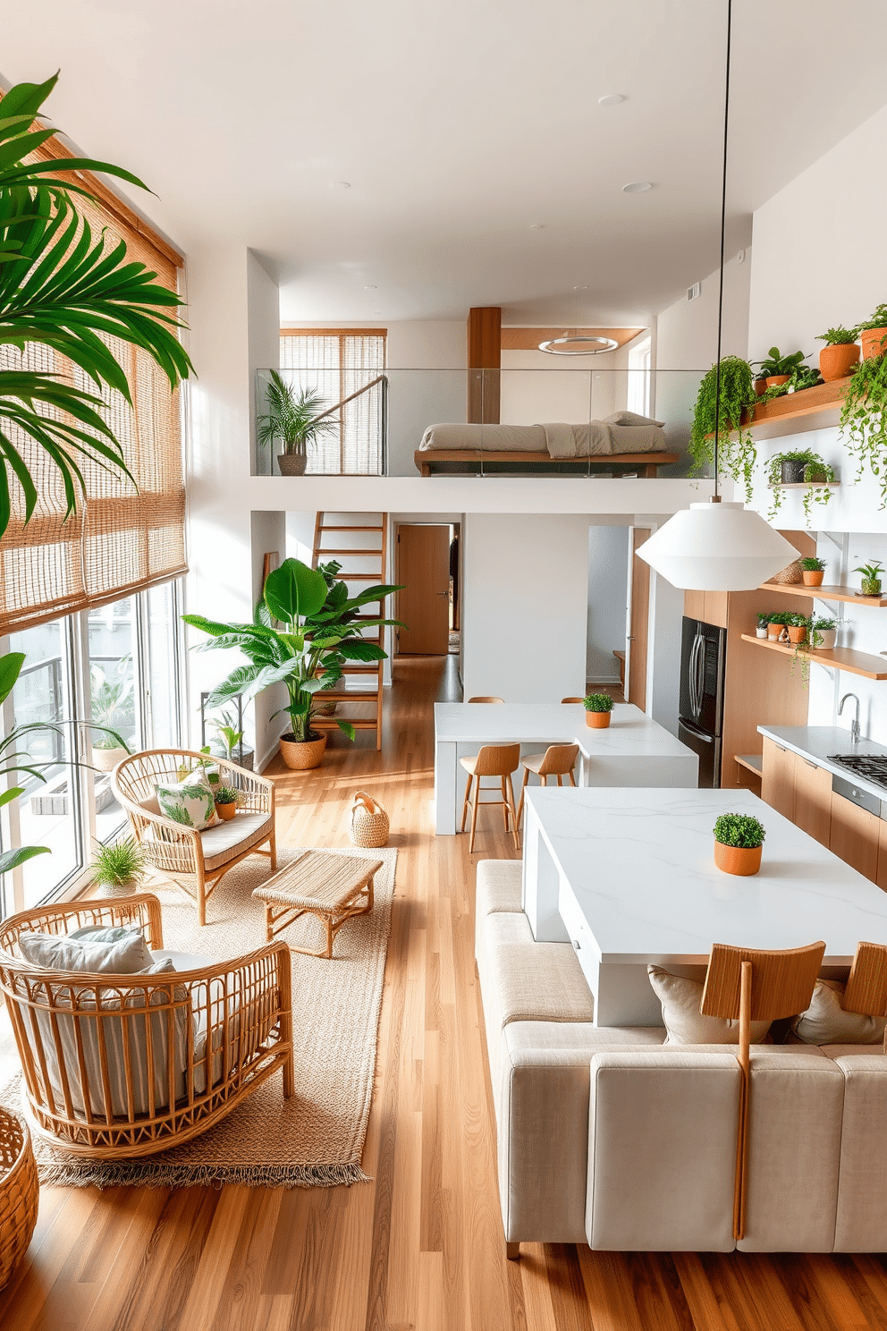 A tropical-themed living room filled with natural textures and lush greenery. A large rattan armchair sits in the corner next to a basket of ferns, while bamboo blinds filter soft natural light onto a jute rug and hardwood floors. A low coffee table in natural wood is surrounded by plush beige sofas adorned with botanical cushions. On the walls, minimal shelves display terracotta planters with cascading vines, completing the serene vibe.