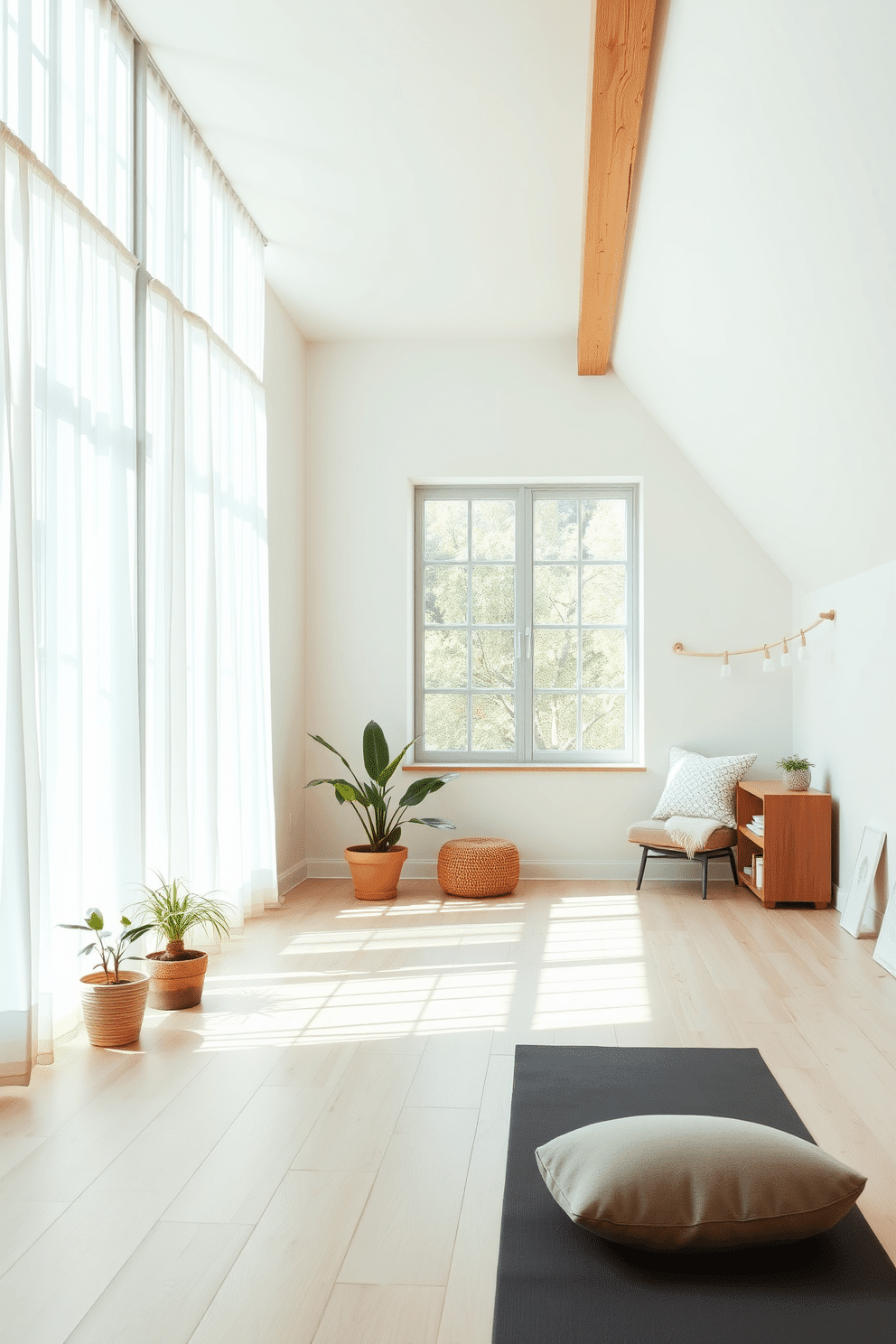 A serene minimalist yoga studio bathed in natural light. The space features light wood flooring, large windows with sheer curtains, and a few potted plants for a calming atmosphere.