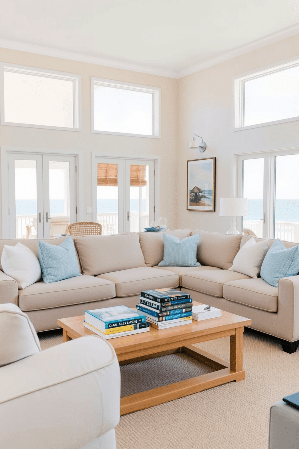 A serene beach living room setting featuring a light, airy atmosphere. A plush, neutral-colored sofa is adorned with soft blue and white throw pillows, while a natural wood coffee table displays an assortment of coffee table books focused on coastal living.