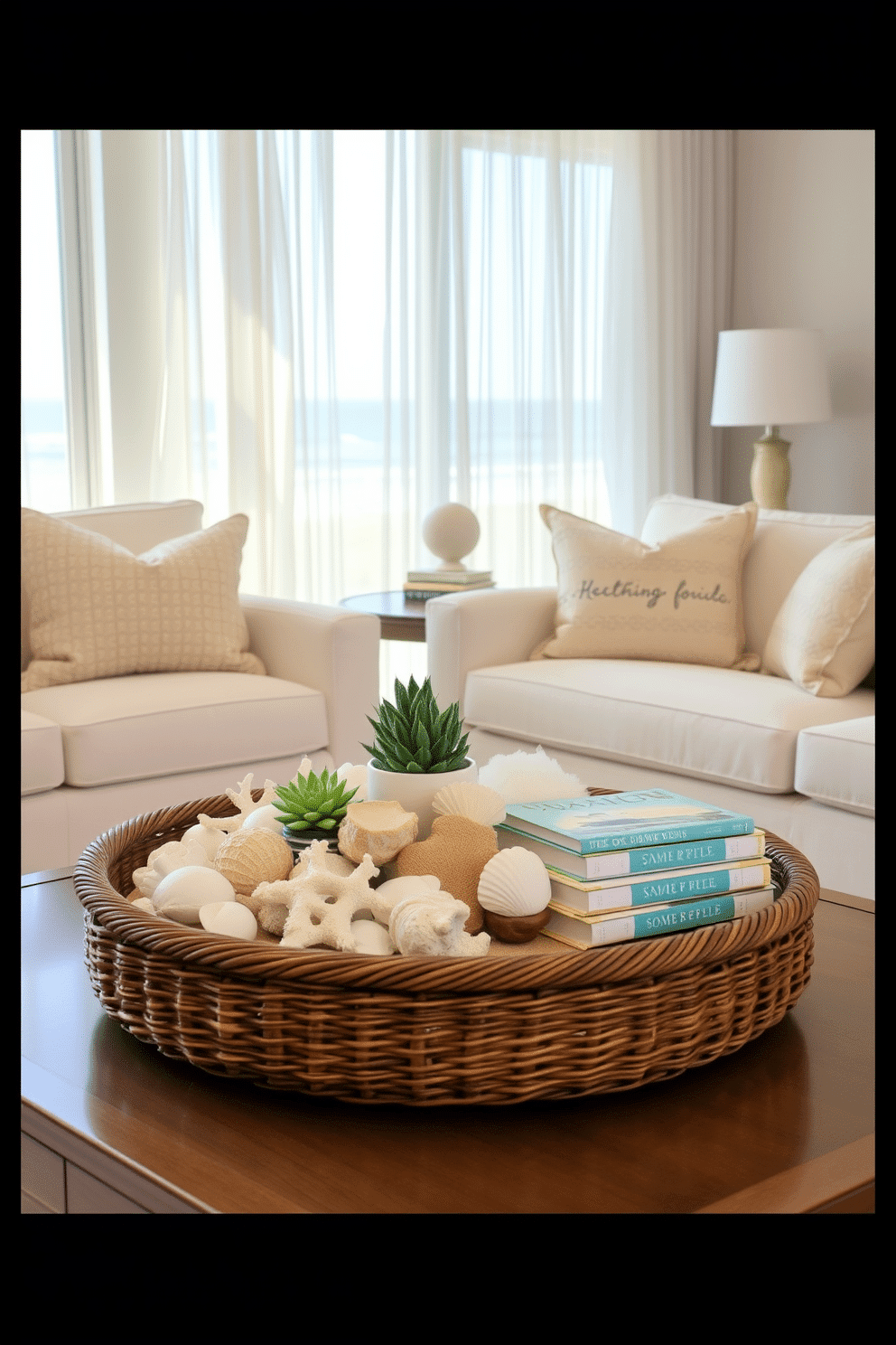 A coastal-inspired coffee table centerpiece features a large, round wicker tray adorned with an array of decorative items. Shells, coral pieces, and a small potted succulent are artfully arranged, complemented by a stack of coffee table books with ocean-themed covers.