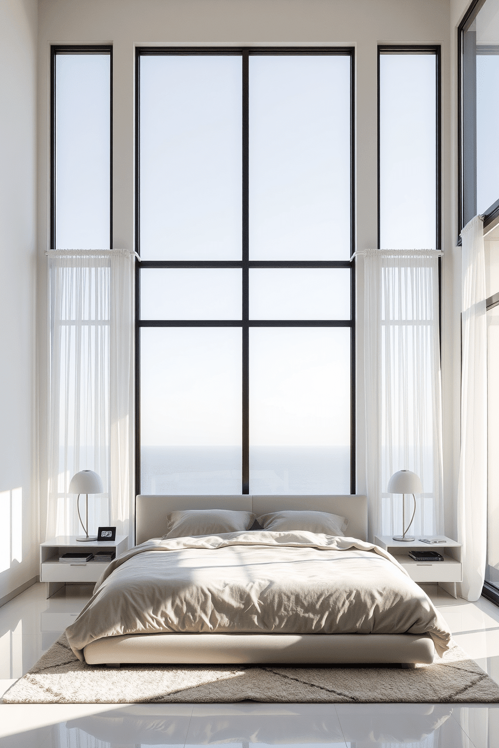 In front of the windows, a plush, oversized bed with neutral-toned bedding sits atop a soft area rug, offering the ideal space for relaxation. Sheer white curtains hang on either side of the windows for added texture, complemented by sleek, sculptural bedside lamps that enhance the room’s contemporary style.