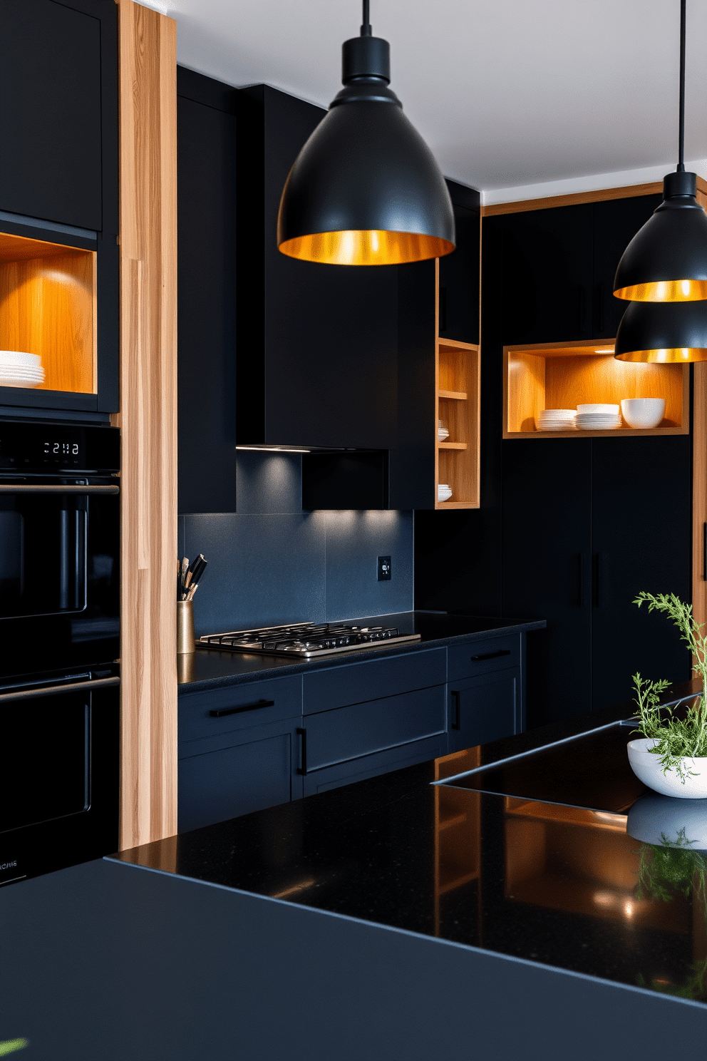 The countertops are a polished black stone that reflects the light softly, contrasted by warm wooden open shelves displaying minimalistic dishware. Under-cabinet lighting highlights the matte texture, while black pendant lights with gold interiors hang above the island for a hint of luxury.