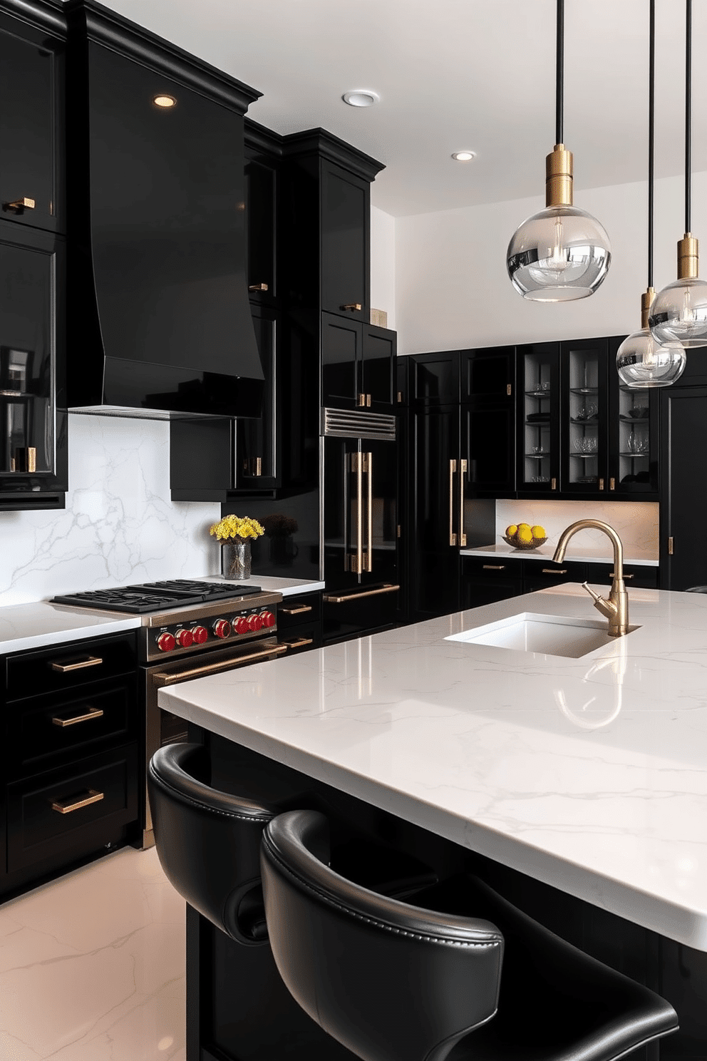 The island is topped with a polished white marble slab, complemented by black barstools with leather upholstery. Overhead, pendant lights with metallic accents provide ambient illumination, reflecting softly against the high-gloss walls.